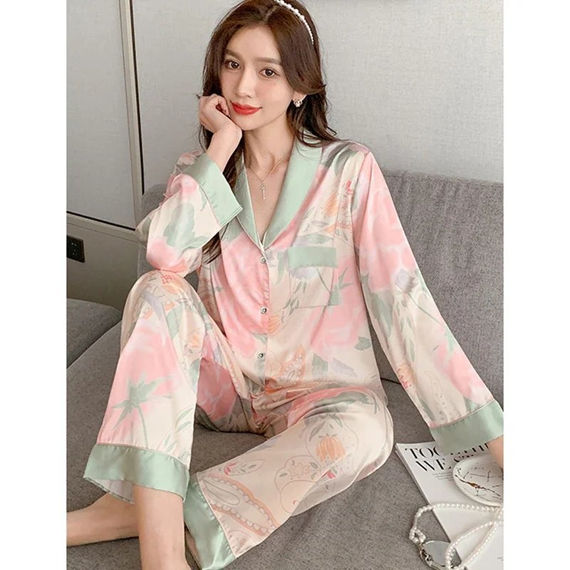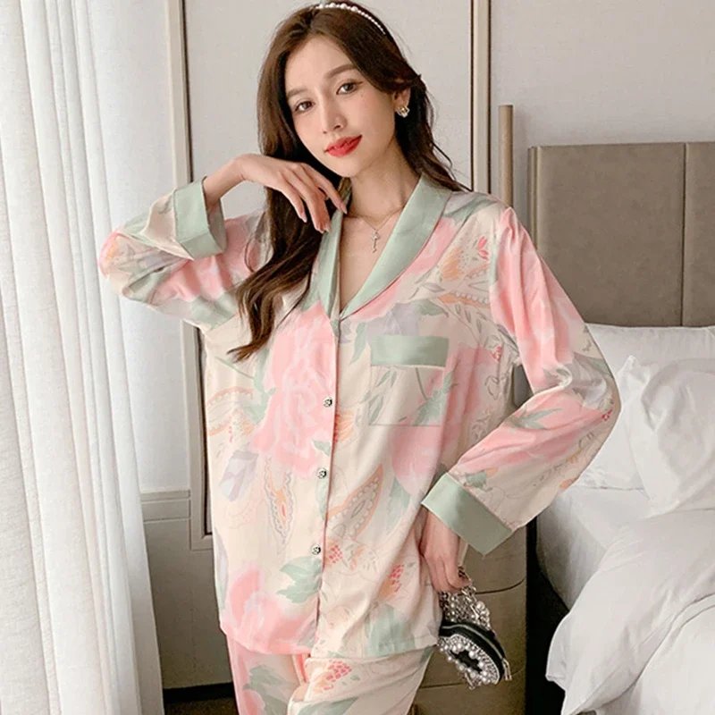 الربيع الصيف فو بيجامة من الحرير للنساء التلبيب سترة صالة مجموعات المرأة 2 قطعة الحلو الأزهار ملابس المنزل لينة ملابس خاصة Pjs