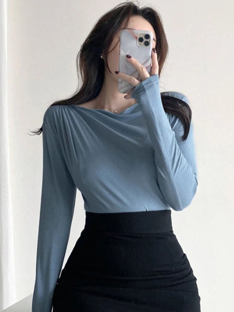 موضة انحراف طوق خارج الكتف طويلة الأكمام تي شيرت المرأة ربيع جديد الصلبة سليم صالح المحاصيل الأعلى مثير الجوف خارج تيز القمصان
