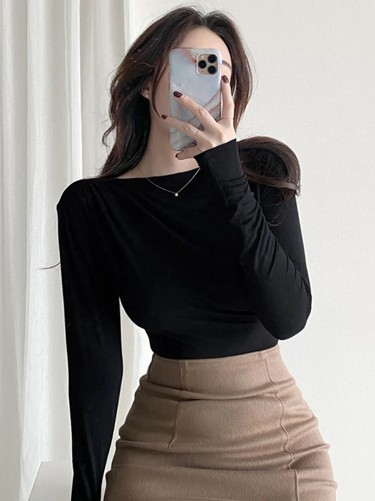 تي شيرت قطني أساسي للنساء ، أكمام طويلة ، تي شيرت مرن ، طراز كوري ، مثير ، رقيق ، صلب ، توب نسائي
