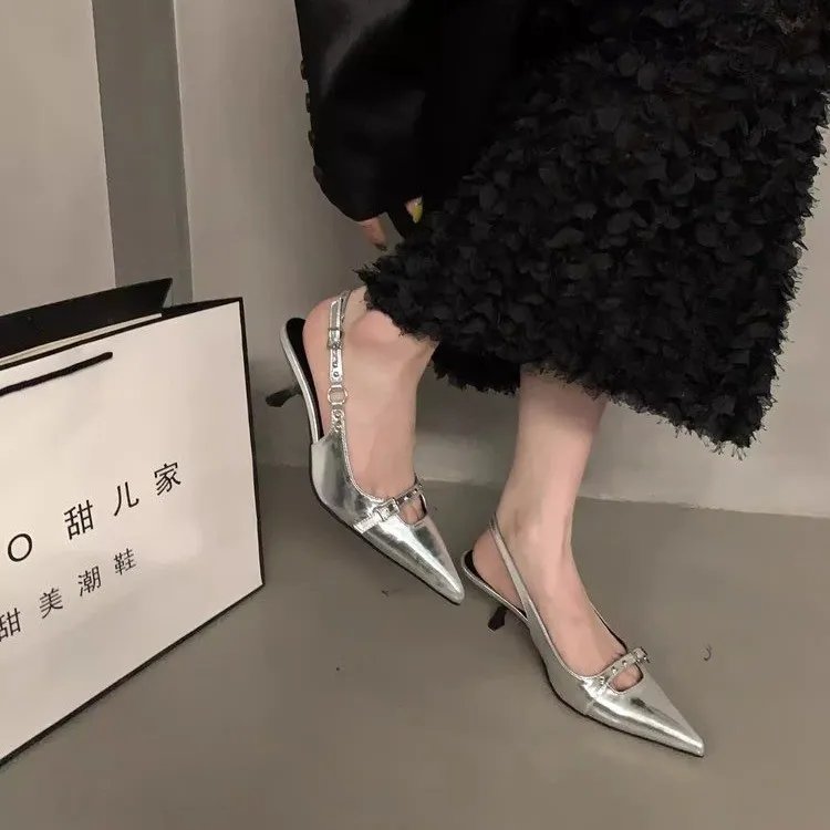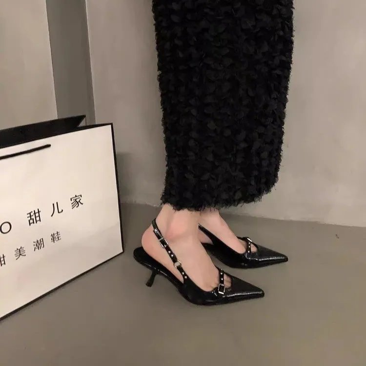 كعب هريرة مدبب أسود براقة ، كعب نحيف ، حزام زر ، صنادل باوتو للإناث ، الصيف