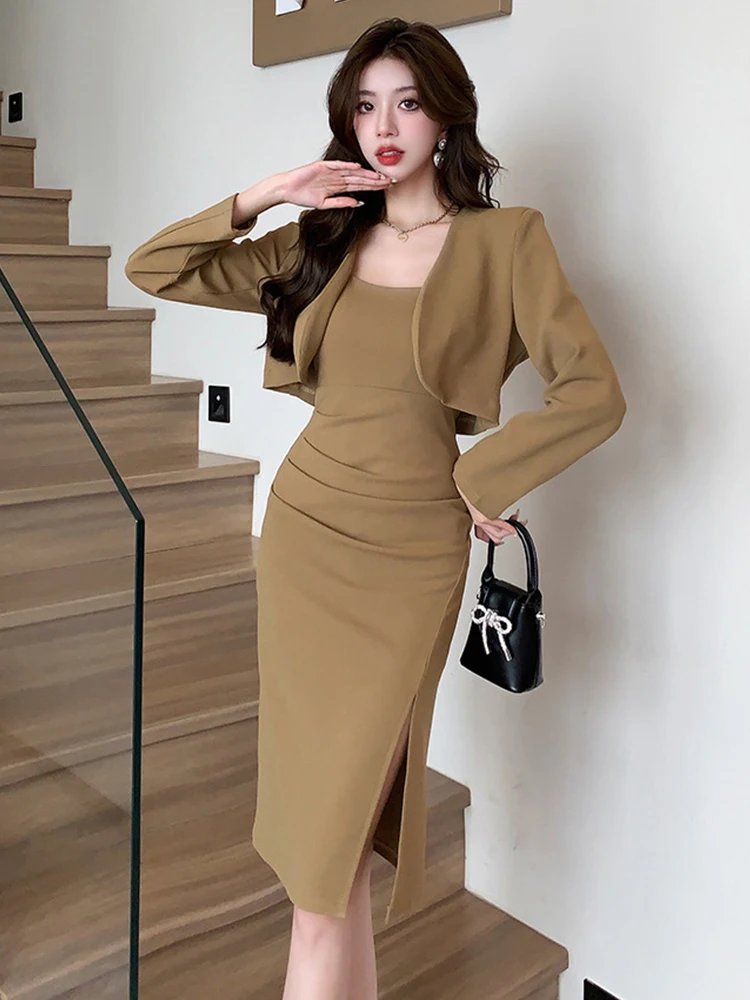ميدي رداء مجموعة فستان للنساء ، 2 قطعة الزي ، ملابس السيدات ، أنيقة قصيرة سترة ، السترة و حزام ، معطف ضئيلة ، الربيع والخريف ، جديد