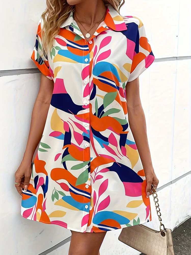Summer Outdoor Casual Loose Comfortable Short-sleeved Dress Flower Print Elegant Dress Daily Urban Fashion Women’s Shirt Dress
