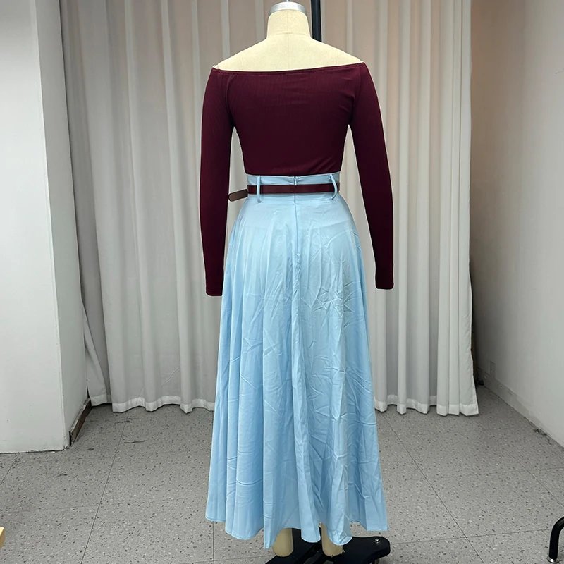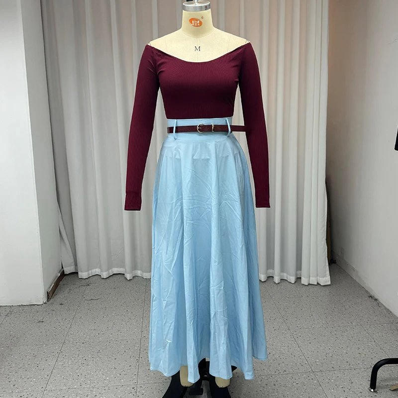 Wefads الخريف المرأة 2 قطعة أنيقة الصلبة طويلة الأكمام قبالة الكتف حمالة الخامس الرقبة البلوز أعلى فضفاض تنورة طويلة مجموعات مع حزام